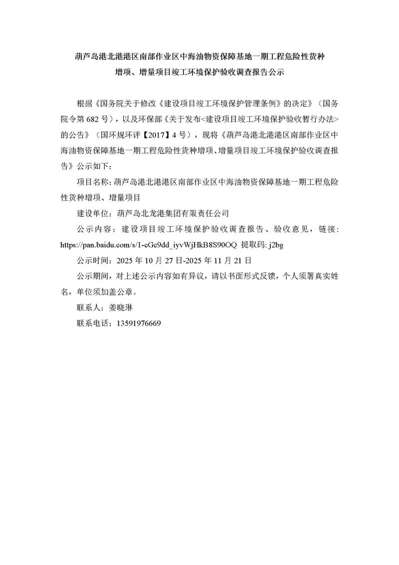 葫蘆島港北港港區(qū)南部作業(yè)區(qū)中海油物資保障基地一期工程危險性貨種 增項、增量項目竣工環(huán)境保護(hù)驗收調(diào)查報告公示